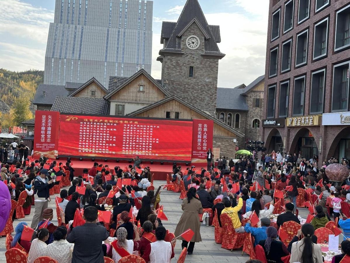 在秋天,新疆阿尔泰山脚下的森林肮脏,烟雾升起了克兰河。 On September 29, on the occasion of the 76th anniversary of the establishment of the People's Republic of China and the 70th anniversary of the establishment of Xinjiang Uygur Autonomous region, a 100-family banquet with the theme of "The Party Flag reflects Gold Mountain and forgotten the heart of the people" wrote a chapter in the Xuedu and the development of Xuedu in a particular person in the Unity and the Development enthusiastic ways.来自城市和人们购物中心的300个模型代表,生活方式占据了30个圆桌会议,将食物作为媒介和角色在强大的歌曲“没有共产党的新中国”中,模特作为灯,并演奏“为中国国家删除强大的社区”的交响曲。